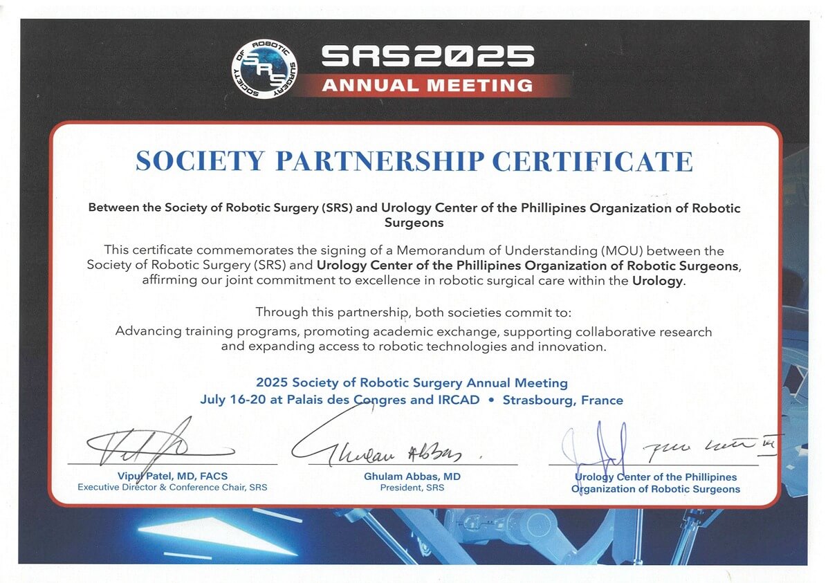 We are proud to be part of a globally aligned program, with UCPI and UCORS (Urology Center of the Philippines Organization of Robotic Surgeons) recognized by the Society of Robotic Surgery (SRS), reinforcing our commitment to international standards, training, and collaboration.